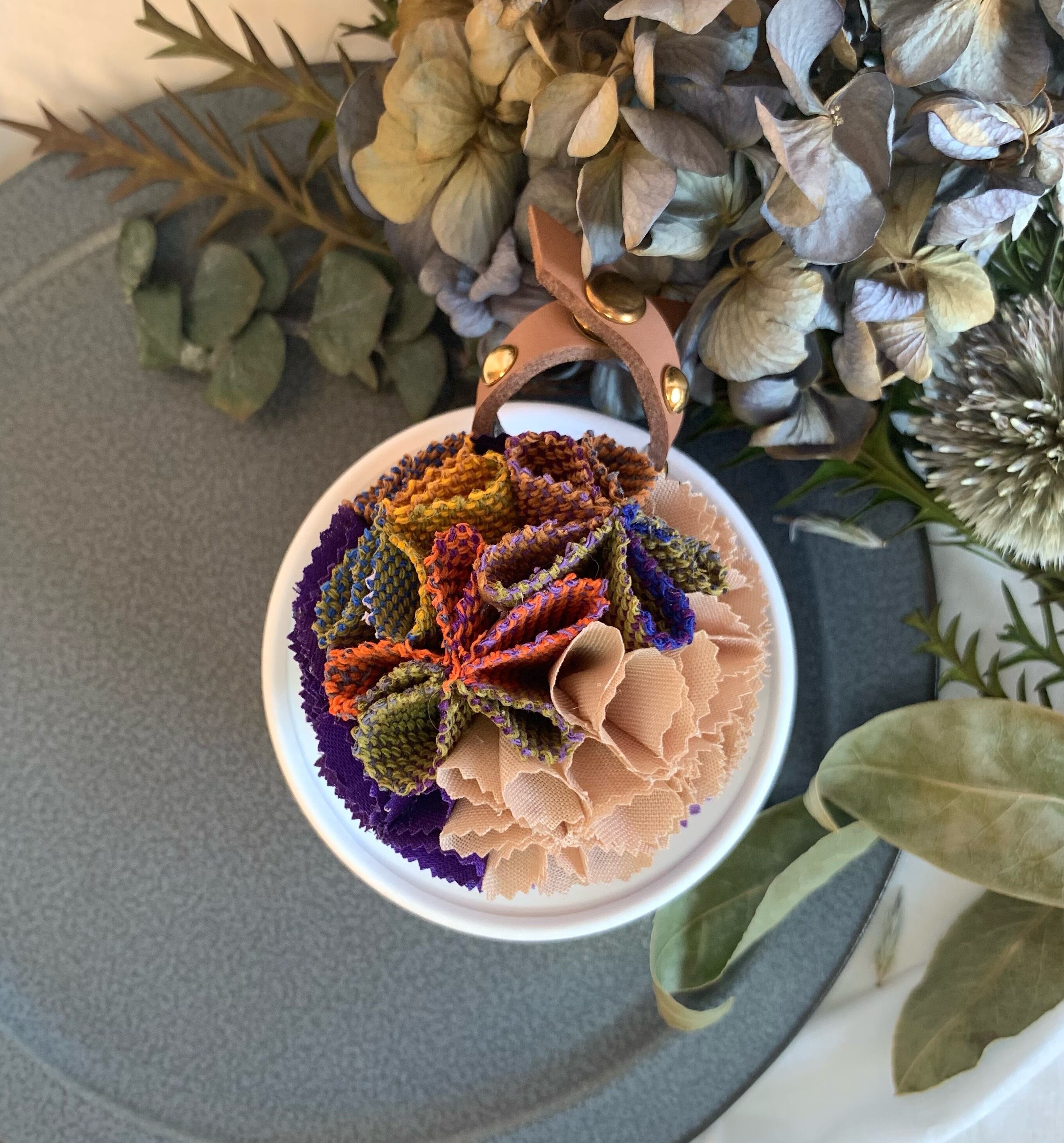 さをり織りを用いた2wayブローチは、コサージュとしてもバックチャームとしてもお使いいただけます。さをり織り使用した美しい色合いが特徴です。コサージュとしてはあなたの胸元にに彩りを加えます。バックチャームとしてはスタッズベルト(ヌメ革)を活用することで、揺れるアクセサリーとして個性的な表現を様々なスタイルに合わせて楽しめます。